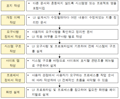 UI 설계서 표지 작성 > 개정 이력 작성 (최초 버전은 1.0) > UI 요구사항 정의서 > 시스템 구조 작성 > 사이트 맵 작성 > 프로세스 정의서 작성 > 화면 설계