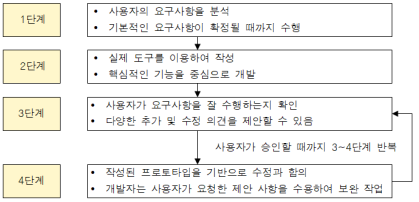 단점 : 프로토타입 제작으로 인해 작업 시간을 증가시킬 수 있음, 필요 이상의 자원 소모, 부분적으로 작업 시 중요한 작업이 생략될수 있음